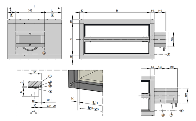 [1] Côté commande [2] Côté installation ① EK2-EU ② Contre-cadre de raccordement (en option) ATTENTION : la taille nominale du contre-cadre de raccordement équivaut toujours à B + 20 mm et H + 20 mm (écart de 10 mm par rapport au bord de l'ailette ouverte de chaque côté). ③ Vis de fixation ④ Joint d'étanchéité ⑤ Libérer de l'espace pour assurer l'accès à l'encastrement du servomoteur ⑥ Encastrement du servomoteur ⑦ Encastrement du module