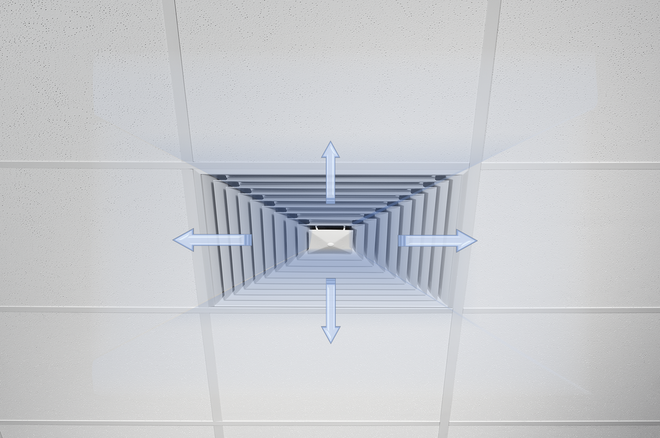 Les diffuseurs plafonniers orientent l'air des systèmes de conditionnement d'air vers le local Le flux qui en résulte induit de hauts niveaux d'air ambiant, réduisant alors rapidement la vitesse du flux et la différence de température entre l'air soufflé et l'air ambiant. Les diffuseurs plafonniers permettent de grands débits d'air. Il en résulte une ventilation mélangée dans les zones de confort, avec une bonne ventilation globale du local, avec très peu de turbulences dans la zone de séjour.