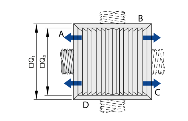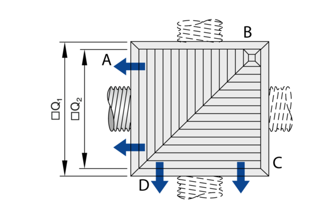 Les diffuseurs plafonniers de type DLK-AK possèdent des ailettes fixes. Soufflage horizontal une à quatre directions. Le soufflage avec une différence de température d'air ambiant peut aller de –10 à +10 K.