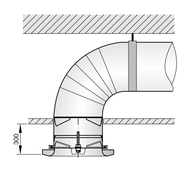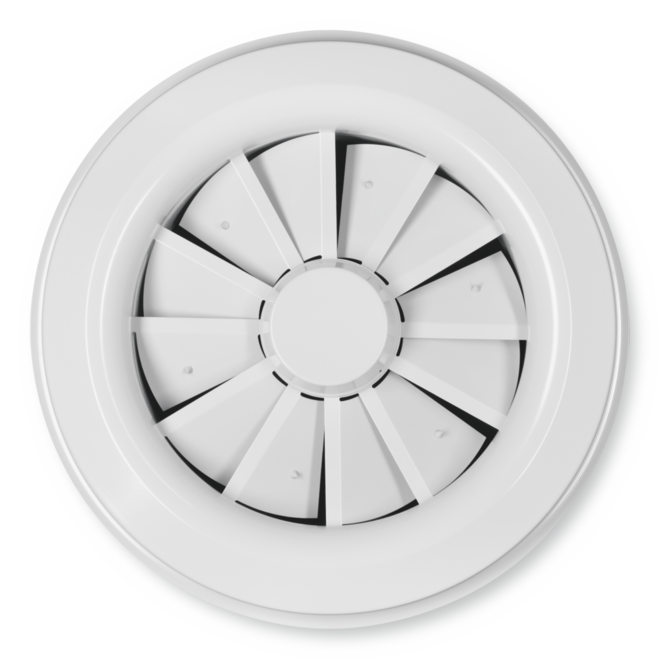Diffuseur plafonnier à jet hélicoïdal et à façade circulaire pour locaux de grande hauteur situées dans les zones de confort et les zones industrielles. Pour soufflage uniquement. Avec ailettes de déflexion fixes pour soufflage horizontal, et avec ailettes réglables pour soufflage horizontal (0°) à vertical (90°). Soufflage horizontal à forte induction. Pour montage suspendu et pour plafonds suspendus.
