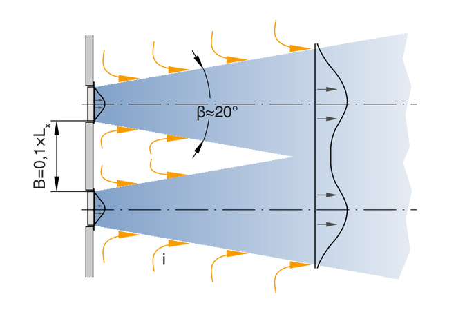 Les grilles de ventilation sont des diffuseurs destinés au soufflage d'air et à la reprise des systèmes de ventilation et de climatisation. Ils orientent l'air soufflé vers la pièce. Les grilles de ventilation à ailettes réglables permettent d'adapter la direction de soufflage aux conditions locales. Il en résulte une ventilation à flux mélangé dans les zones de confort et les zones industrielles, avec une bonne ventilation globale de la pièce. En raison de l'induction, la vitesse du flux d'air soufflé diminue à mesure que l'on s'éloigne de la grille de diffusion. La distance à laquelle la vitesse du flux d'air atteint une valeur définie, comme par exemple 0,35 m/s, est appelée « portée ». Le jet d'air de soufflage qui provient des grilles murales disposées près du plafond atteint une portée supérieure à un jet libre comparable (sans l'effet du plafond) en raison de l'effet du plafond. Les grilles individuelles et les rubans à grille permettent tous d'obtenir des portées différentes. En mode refroidissement, il est nécessaire de tenir compte de la déviation du jet vers la zone occupée, qui augmente dès que la différence de température entre l'air de soufflage et l'air ambiant augmente et que la vitesse de soufflage diminue. En mode chauffage, le jet d'air de soufflage est dévié vers le plafond. Cela n'a aucun effet nuisible sur la vitesse du flux d'air dans la zone occupée, mais peut affecter la ventilation complète de la pièce.