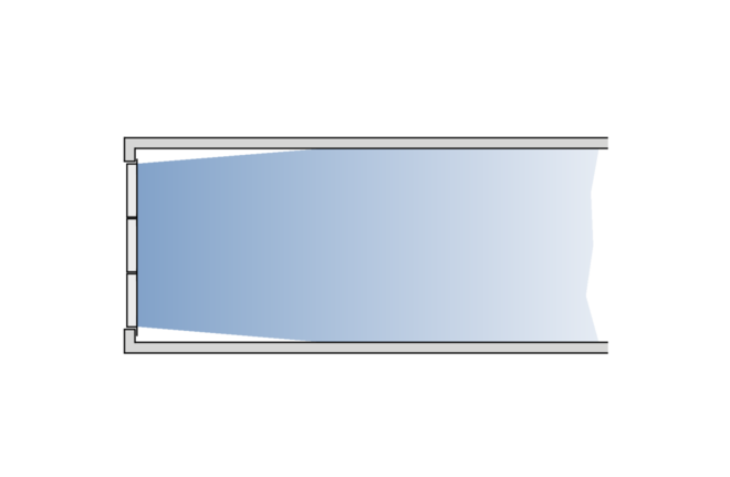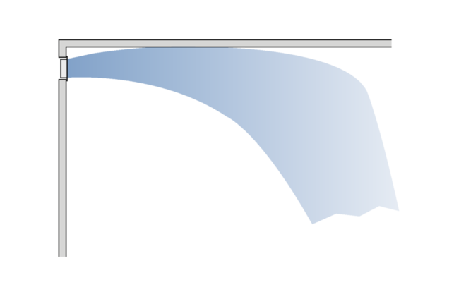 En mode de refroidissement, il est nécessaire de tenir compte de la déviation du jet vers la zone occupée, qui augmente dès que la différence de température entre l'air soufflé et l'air ambiant augmente et que la vitesse de soufflage diminue. En mode de chauffage, le jet d'air soufflé dévie vers le plafond. Cela n'a aucun effet négatif sur la vitesse du flux d'air dans la zone occupée, mais peut affecter la ventilation complète de la pièce.