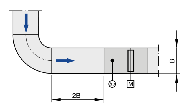 Le Δ de précision du débit s'applique à une section amont rectiligne de la gaine. Les coudes, les tés ou un rétrécissement ou un élargissement de la gaine génèrent des turbulences susceptibles d'affecter la mesure. Les raccordements en gaine, par ex. les ramifications quittant la gaine principale doivent être conformes à la norme EN 1505. Certaines situations de montage nécessitent des sections de gaine rectilignes en amont.