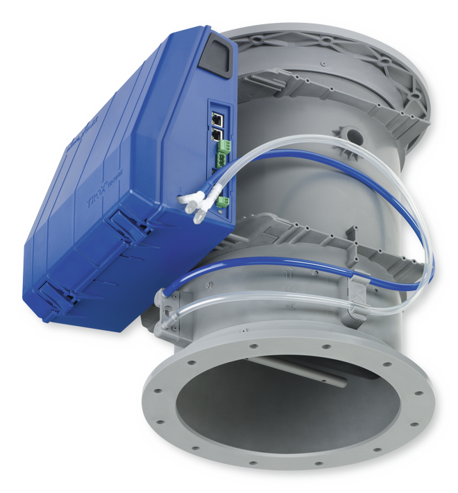 Station circulaire de mesure du débit d'air en polypropylène PPs ignifuge pour la mesure des débits d'air dans les systèmes à débit variables et les sorbonnes. Convient pour la surveillance permanente du débit d'air (signal de valeur réelle) d'air de reprise contenant des substances corrosives puisque tous les composants entrant en contact avec le débit d'air sont en plastique (aucune pièce intérieure en métal). Précision de mesure ± 5 %, même en cas de conditions amont et aval défavorables. Convient aussi pour la régulation du débit par signalisation aux convertisseurs de fréquence Station prête à être mise en service constituée du caisson soit doté d'un capteur de pression effective moyenne et d'un déflecteur ou d'une buse et d'un régulateur électronique. Sonde de pression différentielle avec orifices de mesure de 3 mm (insensibles à la poussière et à la pollution) Manchette convenant aux gaines selon la norme DIN 8077 Fuite d'air du caisson/virole conforme à la norme EN 15727, classe C.
