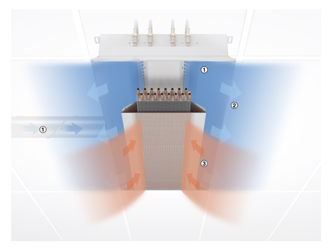 L'air primaire et l'air secondaire se mélangent puis sont soufflés horizontalement dans la pièce à travers les fentes de diffusion.